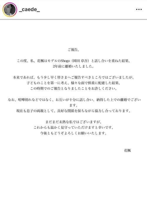 モデルの花楓(かえで、45)が2日までにインスタグラムを更新。2年前に離婚をしていたことを報告した。 花楓は「ご報告」とつづり、文書を公開した。 文書には「この度、私、花楓はモデルのShogo(岡田章吾)と話し合いを重ねた結果、2年前に…