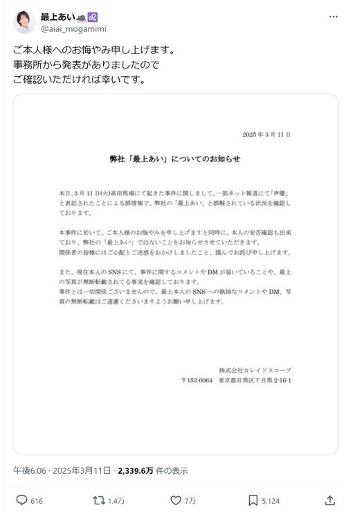 声優の最上あいが12日までにX(旧ツイッター)を更新。都内の路上で起きた殺傷事件の被害者女性を悼んだ。 11日午前9時50分ごろ、東京都新宿区高田馬場の路上で20代女性が刃物で刺され、病院に搬送されたが死亡が確認された。女性は動画配信中…